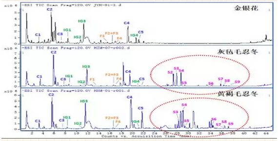 此時(shí)又有人問(wèn)小編了,既然如此相近為什么現(xiàn)在又要將其區(qū)分呢?問(wèn)得真好,容寶寶撓撓頭好好想想。兩者相同之處雖有很多,但除了產(chǎn)地的區(qū)別(金銀花多產(chǎn)于北方,山銀花多產(chǎn)于南方);最明顯的區(qū)別也在于藥材所含天然化合物成分的差異,山銀花中的灰氈毛忍冬皂苷乙Macranthoidin B(S2)、灰氈毛忍冬皂苷甲Macranthoidin A(S3)和川續(xù)斷皂苷乙Dipsacoside B(S4)就是金銀花中所沒(méi)有的。