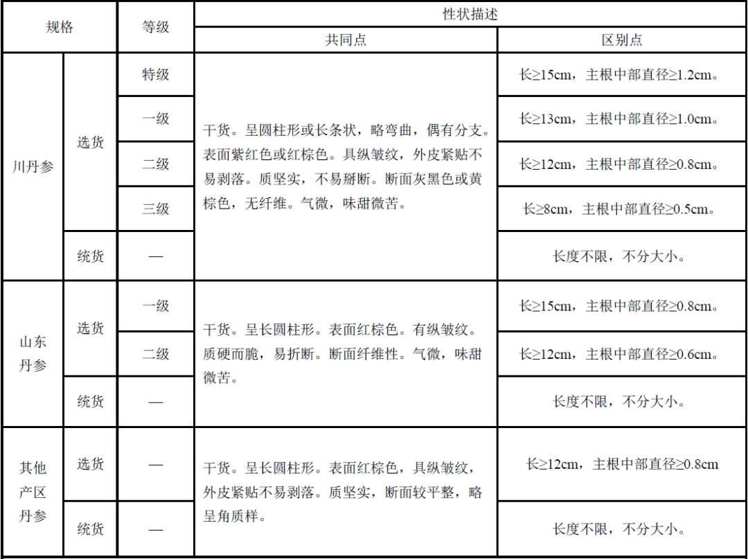 根據(jù)市場(chǎng)流通情況,根據(jù)產(chǎn)地的不同將丹參藥材分為“川丹參”、“山東丹參”和“其他產(chǎn)區(qū)丹參”三個(gè)規(guī)格,對(duì)藥材是否進(jìn)行等級(jí)劃分,將丹參分為“選貨”和“統(tǒng)貨”兩個(gè)規(guī)格。在此規(guī)格下主要按照根的直徑進(jìn)行等級(jí)的劃分,即直徑越大等級(jí)越高。