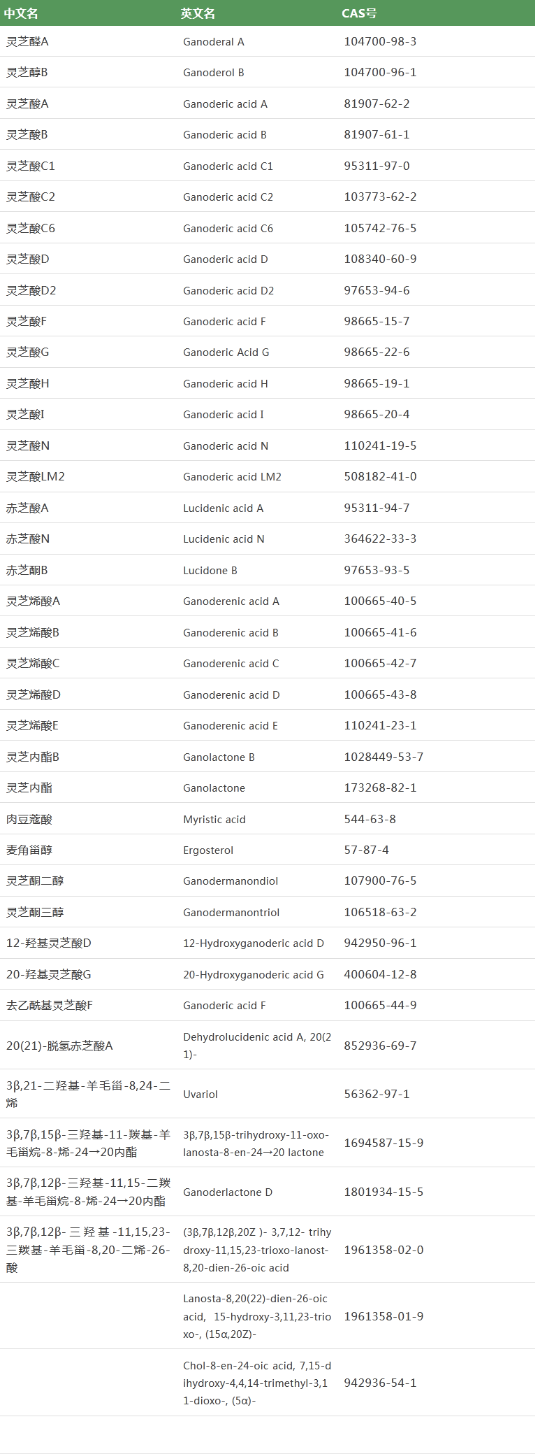 目前我司化合物庫有多種靈芝活性成分,針對以下重點推薦的產(chǎn)品,普思生物均現(xiàn)貨供應(yīng),當(dāng)天發(fā)貨。