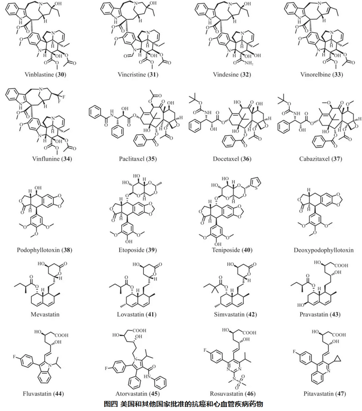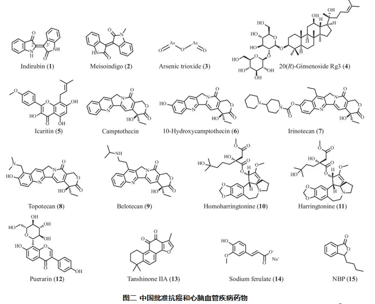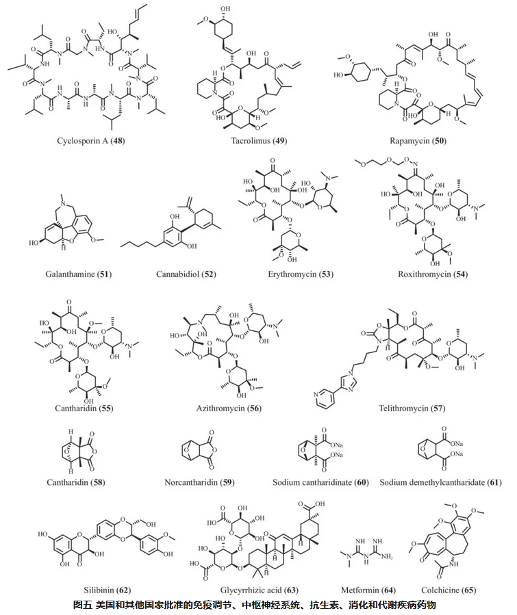 根據各種疾病的臨床治療需求,本綜述介紹了65種具有代表性的藥物,這些藥物或直接來源于天然產物,或來源于天然產物的衍生物。這些藥物已獲得國家醫(yī)藥產品管理局(NMDA)、美國食品藥品監(jiān)督管理局(FDA)、歐洲藥品管理局和日本藥品醫(yī)療器械管理局等監(jiān)管機構的批準。在這些藥物中,有29種是在中國開發(fā)的,其余36種是在國際上獲得批準的。