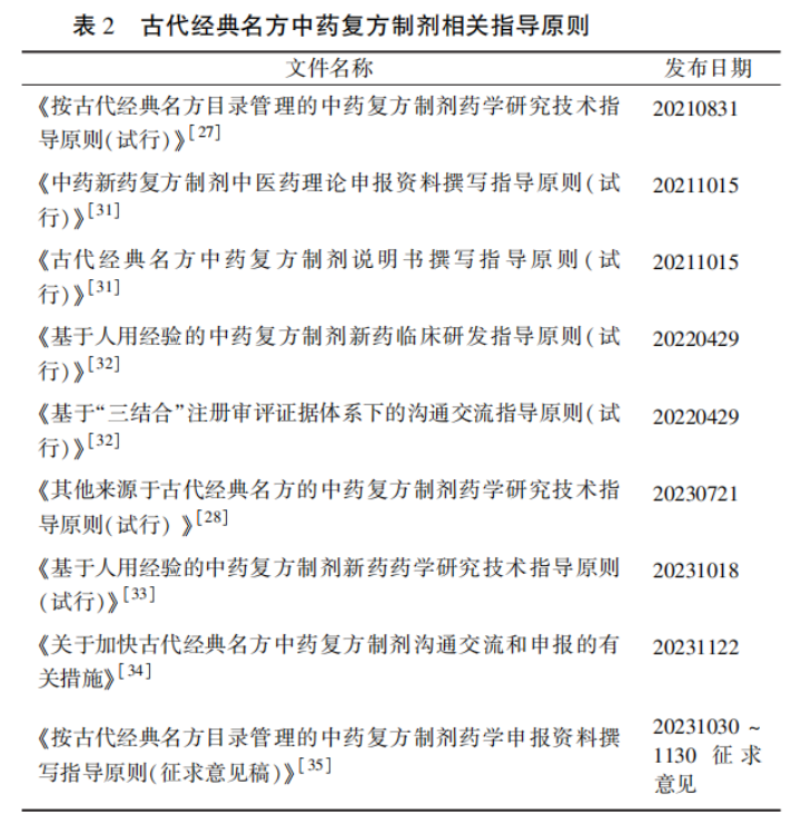 2019年12月以來新型冠狀病毒肺炎在全球蔓延,在這次抗擊疫情過程中,中醫(yī)藥通過臨床篩選出的有效方劑發(fā)揮了重要的作用。抗疫期間,國家藥監(jiān)局采取早期介入、研審聯(lián)動等措施,邊審評、邊研究、邊總結(jié),探索優(yōu)化中藥注冊分類,批準(zhǔn)了多個古代經(jīng)典名方中藥復(fù)方制劑:2021 年 3 月 2 日,源自抗疫“三方”的清肺排毒顆粒、化濕敗毒顆粒、宣肺敗毒顆粒通過特別審批程序上市;2022 年10 月 9 日,散寒化濕顆粒上市。為促進(jìn)古代經(jīng)典名方制劑研發(fā),推進(jìn)疫情防控成果轉(zhuǎn)化,藥審中心將審評的經(jīng)驗(yàn)進(jìn)行總結(jié),制定了古代經(jīng)典名方復(fù)方制劑的相關(guān)指導(dǎo)原則(表 2),加強(qiáng)技術(shù)標(biāo)準(zhǔn)體系建設(shè),全程加速相關(guān)品種的研發(fā)、申報(bào)和審評進(jìn)度。2022 年 12 月 28 日首個中藥3. 1類制劑苓桂術(shù)甘顆粒獲批上市,2023 年以來,枇杷清肺顆粒、濟(jì)川煎顆粒、一貫煎顆粒和芍藥苷草顆粒等多個中藥3. 1類品種獲批上市。