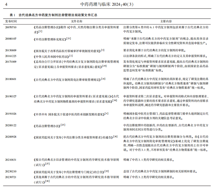 2015年《國務(wù)院關(guān)于改革藥品醫(yī)療器械審評審批制度的意見》明確要求“簡化來源于古代經(jīng)典名方的復(fù)方制劑的審批”。2016 年《中華人民共和國中醫(yī)藥法》(以下簡稱《中醫(yī)藥法》) 明確“古代經(jīng)典名方,是指至今仍廣泛應(yīng)用、療效確切、具有明顯特色與優(yōu)勢的古代中醫(yī)典籍所記載的方劑。” “生產(chǎn)符合國家規(guī)定條件的來源于古代經(jīng)典名方的中藥復(fù)方制劑,在申請藥品批準(zhǔn)文號時,可以僅提供非臨床安全性研究資料。具體管理辦法由國務(wù)院藥品監(jiān)督管理部門會同中醫(yī)藥主管部門制定?!?這一立法規(guī)定大大加快了該類中藥復(fù)方制劑研究申報(bào)注冊的相關(guān)進(jìn)程,特別是相關(guān)注冊管理法規(guī)政策文件的出臺。見表1。2018年國家藥監(jiān)局發(fā)布了《古代經(jīng)典名方中藥復(fù)方制劑簡化注冊審批管理規(guī)定》,明確“經(jīng)典名方制劑的研制分‘經(jīng)典名方物質(zhì)基準(zhǔn)’研制與制劑研制兩個階段”,國家藥監(jiān)局發(fā)布統(tǒng)一“經(jīng)典名方物質(zhì)基準(zhǔn)”,可以分兩個階段提交申報(bào)資料。2020年新版《藥品注冊管理辦法》在中藥注冊分類中新增了古代經(jīng)典名方中藥復(fù)方制劑分類,并在隨后發(fā)布的《國家藥監(jiān)局關(guān)于發(fā)布〈中藥注冊分類及申報(bào)資料要求〉的通告》中將其細(xì)分為“按古代經(jīng)典名方目錄管理的中藥復(fù)方制劑” ( 以下簡稱中藥 3. 1 類)和“其他來源于古代經(jīng)典名方的中藥復(fù)方制劑” (以下簡稱中藥 3. 2 類)兩種情形,明確“注冊申請人一次性直接提出古代經(jīng)典名方中藥復(fù)方制劑的上市許可申請”,“不再審核發(fā)布‘經(jīng)典名方物質(zhì)基準(zhǔn)’統(tǒng)一標(biāo)準(zhǔn)”,從而進(jìn)一步簡化了該類制劑的注冊流程。2023年《中藥注冊管理專門規(guī)定》明確了古代經(jīng)典名方中藥復(fù)方制劑“不需要開展非臨床有效性研究和臨床試驗(yàn)”,并明確了該類制劑注冊管理總體要求、審評模式等。國家藥監(jiān)局藥品審評中心(以下簡稱藥審中心) 分別于2021年和2023年發(fā)布了《按古代經(jīng)典名方目錄管理的中藥復(fù)方制劑藥學(xué)研究技術(shù)指導(dǎo)原則(試行)》和《其他來源于古代經(jīng)典名方的中藥復(fù)方制劑藥學(xué)研究技術(shù)指導(dǎo)原則(試行)》,明確了中藥 3. 1 類和中藥 3. 2 類的藥學(xué)研究要求。