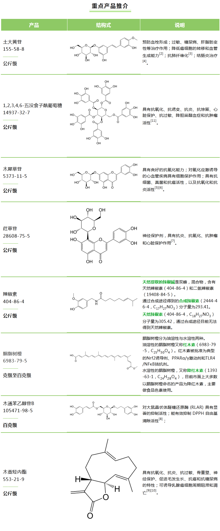 高純度化學(xué)試劑包括藥物研發(fā)試劑及中間體、功能性食品/保健品成分、化妝品成分、香精香料等,廣泛應(yīng)用于藥學(xué)、食品、化妝品等領(lǐng)域研發(fā)及生產(chǎn)。普思生物憑借多年深耕天然產(chǎn)物分離純化的成熟技術(shù)經(jīng)驗,可現(xiàn)貨提供多種極高性價比的克級至公斤級高純度化學(xué)試劑,為科研用戶和企業(yè)用戶提供高質(zhì)量、高標(biāo)準(zhǔn)的研發(fā)工具和原料支持。