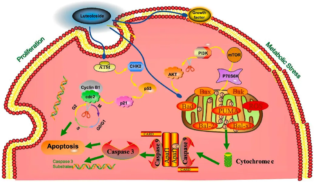3.結(jié)直腸癌:木犀草苷通過(guò)雙重機(jī)制(線粒體凋亡通路激活和PI3K/AKT/mTOR通路抑制)抑制HCT116細(xì)胞增殖并誘導(dǎo)凋亡,其IC50為44.1μM,可作為功能性膳食成分或個(gè)性化營(yíng)養(yǎng)治療的潛在候選物,為結(jié)直腸癌的天然藥物開(kāi)發(fā)提供理論依據(jù)。[7]