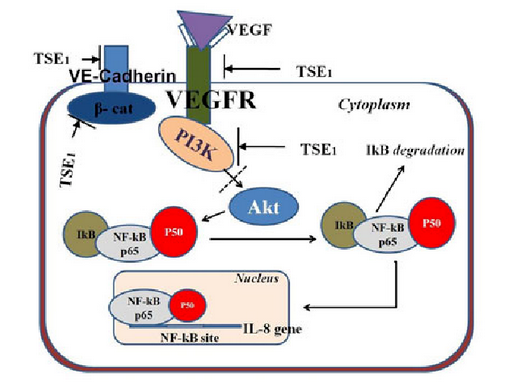 3、抗血管生成:茶皂素E1通過抑制VEGF受體復合物和NF-κB激活,抑制血管內皮細胞的管狀結構形成,展示出抗血管生成作用,對于抑制腫瘤生長和轉移具有重要意義。