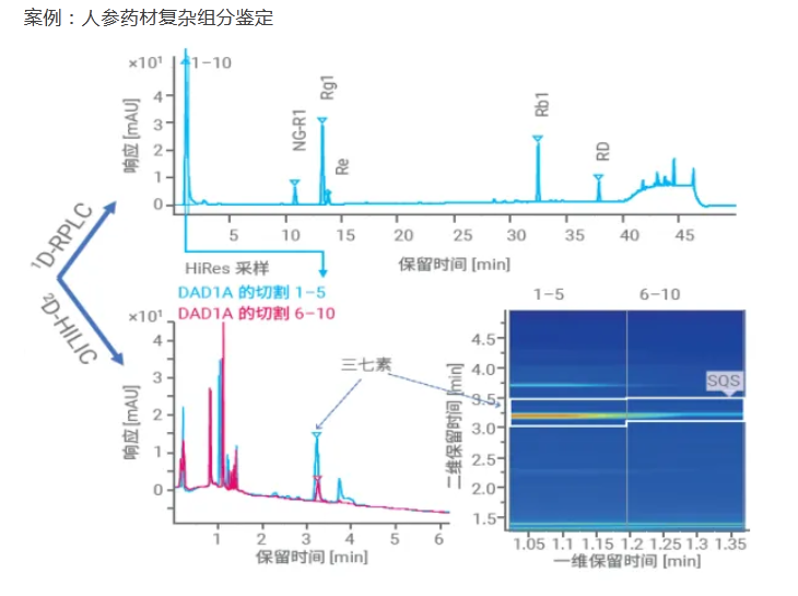 對(duì)于中藥復(fù)雜組分鑒定而言,二維液相串聯(lián)高分辨質(zhì)譜系統(tǒng)的優(yōu)勢(shì)在于,可在二維使用不同選擇性的色譜柱和色譜條件,使一維共流出的成分在二維得到較好分離,并進(jìn)入高分辨質(zhì)譜進(jìn)行鑒定分析。