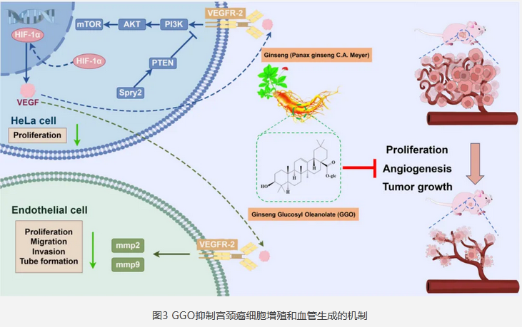 研究者通過(guò)酶轉(zhuǎn)化將人參皂苷Ro轉(zhuǎn)化為人參葡萄糖基齊墩果酸(GGO),通過(guò)抑制PI3K/AKT/HIF-1α信號(hào)通路,減少HIF-1α的核轉(zhuǎn)位和VEGF的表達(dá),從而抑制宮頸癌細(xì)胞的增殖和血管生成。[10]