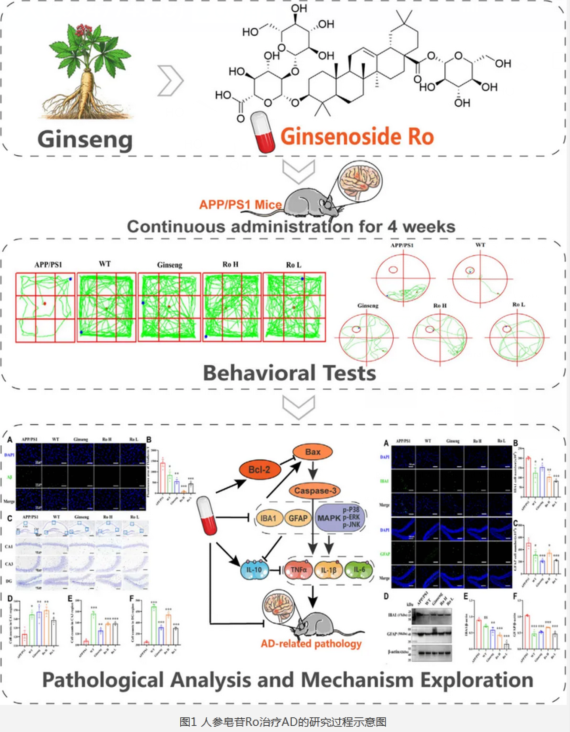 人參皂苷Ro通過(guò)減少Aβ沉積、改善神經(jīng)元凋亡和神經(jīng)炎癥,以及調(diào)控MAPK通路來(lái)實(shí)現(xiàn)改善空間探索能力、記憶認(rèn)知功能。具有開(kāi)發(fā)成為AD治療藥物的潛力。[5][6]