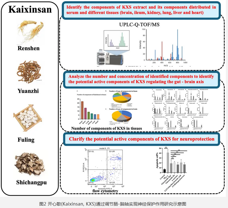 人參皂苷Ro作為開(kāi)心散(Kaixinsan, KXS)的重要活性成分,通過(guò)調(diào)節(jié)腸-腦軸實(shí)現(xiàn)神經(jīng)保護(hù)作用。為KXS在防治阿爾茨海默病、抑郁癥等神經(jīng)退行性疾病中的應(yīng)用提供了理論依據(jù)。[7]